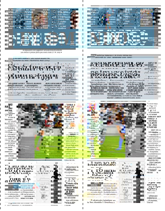 EL MUNDO: "Esta estructura es un serio problema para el jugador"; "Mourinho se inventó gastos por un millón de euros para no pagar impuestos"; "Europa, en vilo por el referendum italiano y las elecciones en Austria"; "Ramos siempre rescata al Madrid"; "El nuevo pacto entre PP y PSOE margina a Podemos y a C's; "El porno-espía gay que surgió de Almería".