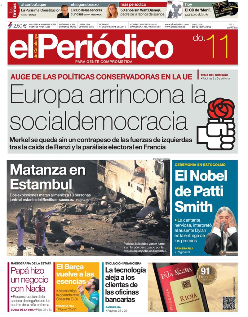 EL PERIÓDICO: "Europa arrincona la socialdemocracia"; "Matanza en Estambul"; "El Nobel de Patti Smith"; "Papá hizo un negocio con Nadia"; "El Barça vuelve a las esencias"; "La tecnología aleja a los clientes de las oficinas bancarias".
