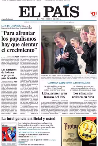 EL PAÍS: "Luis de Guindos, ministro de Economía, Industria y Competitividad: 'Para afrontar los populismos hay que alentar el crecimiento'"; "Las corrientes de Podemos se preparan para la batalla"; "Colombia, una guerra menos en el mundo"; "Libia, primer gran fracaso del ISIS"; "Los yihadistas resisten en Siria"; "La inteligencia artificial y usted".