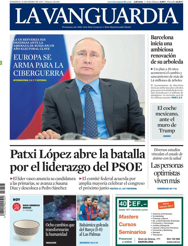 LA VANGUARDIA: "Europa se arma para la ciberguerra"; "Barcelona inicia una ambiciosa renovación de su arboleda"; "Patxi López abre la batalla por el liderazgo del PSOE"; "El coche mexicano, ante el muro de Trump"; "Las personas optimistas viven más".