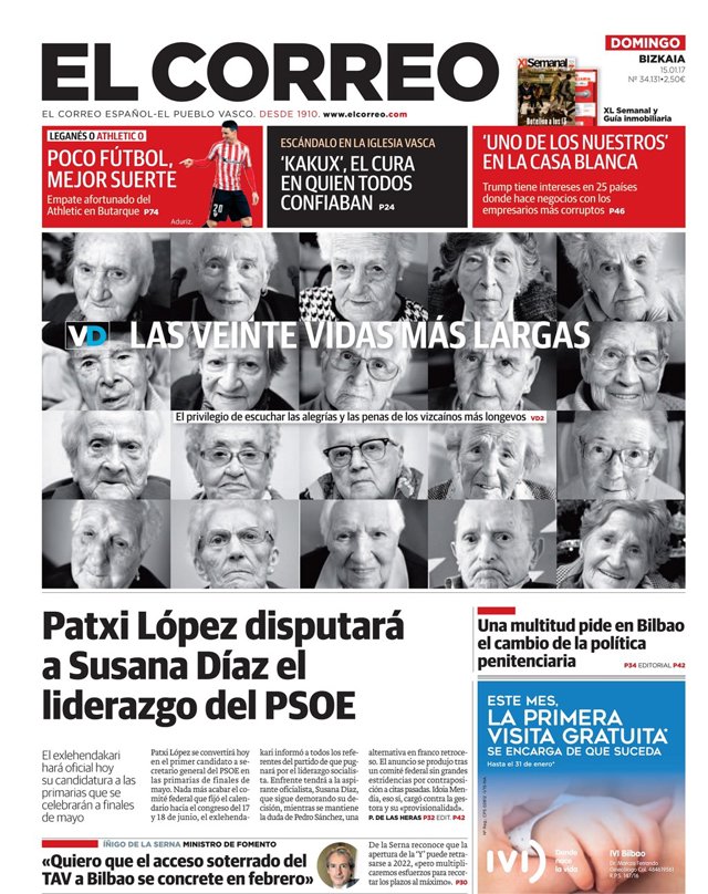 EL CORREO: "Las veinte vidas más largas"; "Patxi López disputará a Susana Díaz el liderazgo del PSOE"; "Una multitud pide en Bilbao el cambio de la política penitenciaria"; "Quiero que el acceso soterrado del TAV a Bilbao se concentre en febrero".