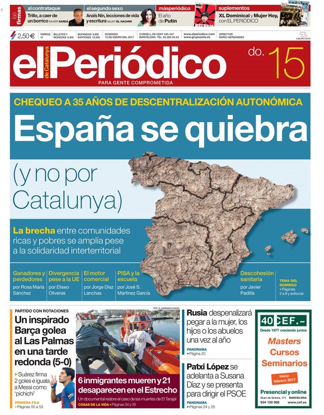 EL PERIÓDICO: "España se quiebra"; "Un inspirado Barça golea a Las Palmas en una tarde redonda (5-0)"; "6 inmigrantes mueren y 21 desaparecen en el Estrecho"; "Rusia despenalizará pegar a la mujer, los hijos o los abuelos una vez al año"; "Patxi López se adelanta a Susana Díaz y se presenta para dirigir el PSOE".