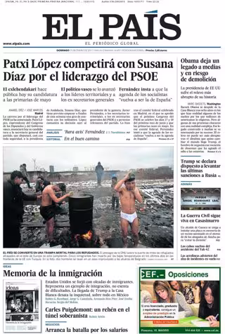 EL PAÍS: "Patxi López competirá con Susana Díaz por el liderazgo del PSOE"; "Obama deja un legado a medias y en riesgo de demolición"; "Trump se declara dispuesto a levantar las últimas sanciones a Rusia"; "La Guerra Civil sigue viva en Casasimarro"; "Los cabos sueltos del accidente del Tak-42"; "Las aerolíneas advierten del alza de incidente en vuelo"; "Memoria de la inmigración"; "Carles Puigdemont: un rehén en un túnel soberanista": "Arranca la batalla por los salarios".