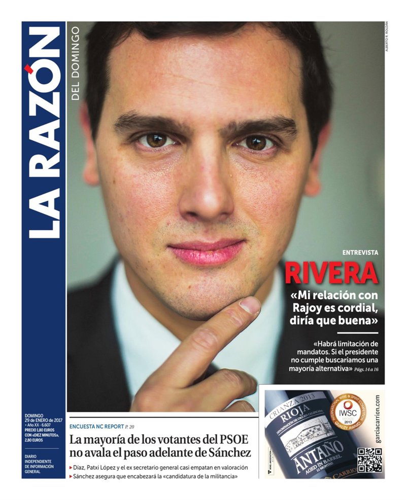 LA RAZÓN: "Entrevista a Albert Rivera: "Mi relación con Rajoy es cordial, diría que buena"; "La mayoría de los votantes del PSOE no avala el paso adelante de Sánchez".