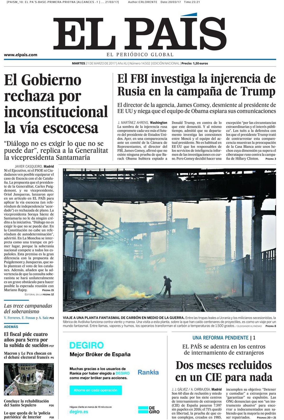 EL PAÍS: "El Gobierno rechaza por inconstitucional la vía escocesa"; "El FBI investiga la injerencia de Rusia en la campaña de Trump"; "Dos meses recluidos en un CIE para nada"; "El fiscal pide cuatro años para Serra por la subida de sueldos"; Macron y Le Pen chocan en el debate electoral francés"; "Concluye la rehabilitación del Santo Sepulcro"; "Lo que queda de la 'policía patriótica' de Interior".