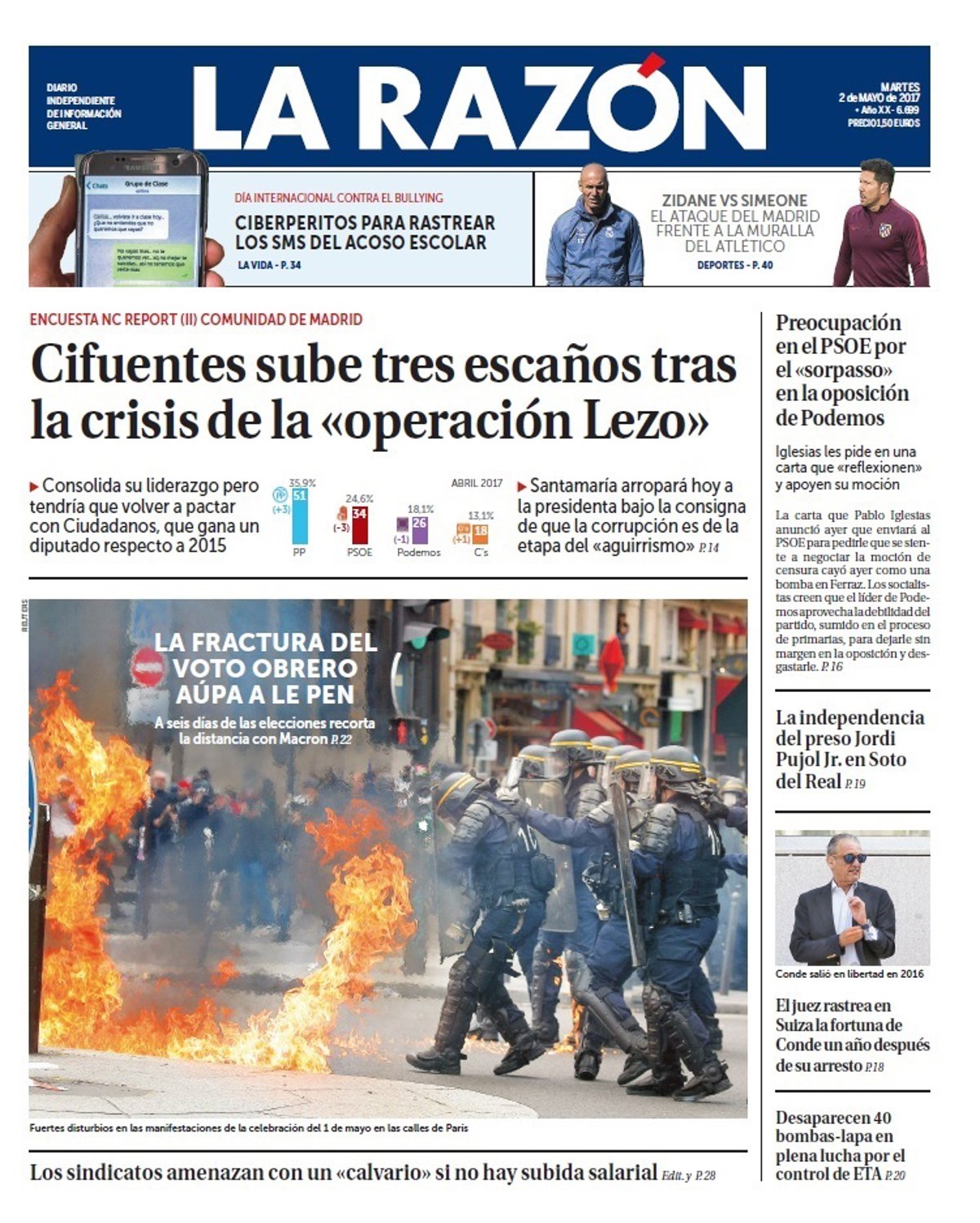LA RAZÓN: "Cifuentes sube tres escaños tras la crisis de la 'operación Lezo'"; "La fractura del voto obrero aúpa a Le Pen"; "Los sindicatos amenazan con un 'calvario' si no hay subida salarial"; "Preocupación en el PSOE por el 'sorpasso' en la oposición de Podemos"; "La independencia del preso Jordi Pujol Jr. en Soto del Real"; "El juez rastrea en Suiza la fortuna de Conde un año después de su arresto"; "Desaparecen 40 bombas-lapa en plena lucha por el control de ETA".