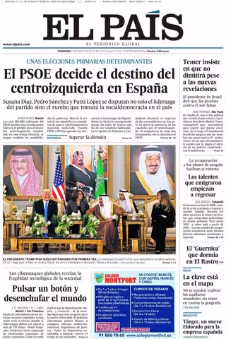 EL PAÍS: "El PSOE decide el destino del centroizquierda en España"; "Pulsar un botón y desenchufar el mundo"; "Temer insiste en que no dimitirá pese a las nuevas revelaciones"; "Los talentos que emigraron empiezan a regresar"; "El 'Guernica' que dormía en El Rastro"; "Tánger, un nuevo Eldorado para la empresa española".