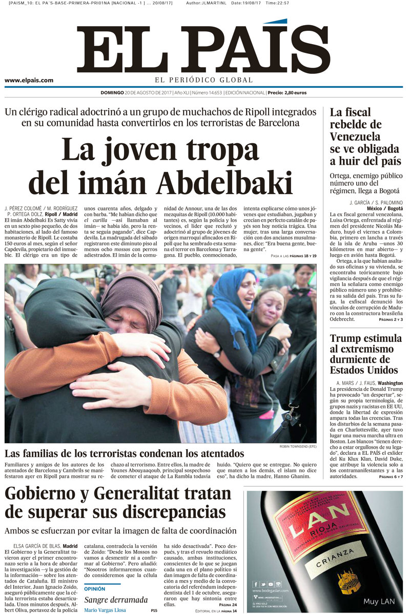 --EL PAÍS: "La joven tropa del imán Abdelbaki"; "Las familias de los terroristas condenan los atentados"; "Gobierno y Generalitat tratan de superar sus discrepancias"; "La fiscal rebelde de Venezuela se ve obligada a huir del país"; "Trump estimula al extremismo durmiente de Estados Unidos".