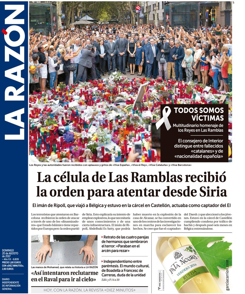 --LA RAZÓN: "La célula de Las Ramblas recibió la orden para atentar desde Siria"; "Todos somos víctimas"; "Así intentaron reclutarme en el Raval para ir al cielo"; "Retrato de las cuatro parejas de hermanos que sembraron el terror: 'Paraban en el arcén para rezar'"; "Independentismo entre paréntesis. El mundo cultural, de Boadella a Francesc de Carreras, duda de la unidad".