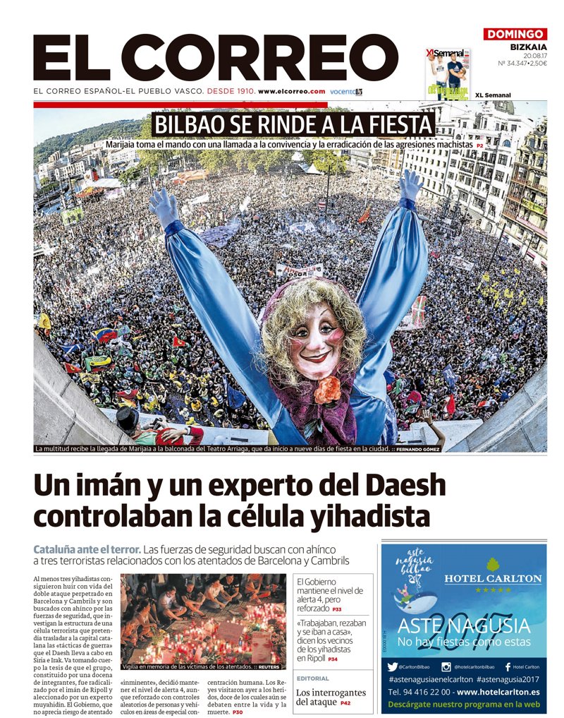 --EL CORREO: "Un imán y un experto del Dáesh controlaban la célula yihadista"; "El Gobierno mantiene el nivel de alerta 4, pero reforzado"; "'Trabajaban, rezaban y se iban a casa', dicen los vecinos de los yihadistas en Ripoll"; "Los interrogantes del ataque"; "Bilbao se rinde a la fiesta".
