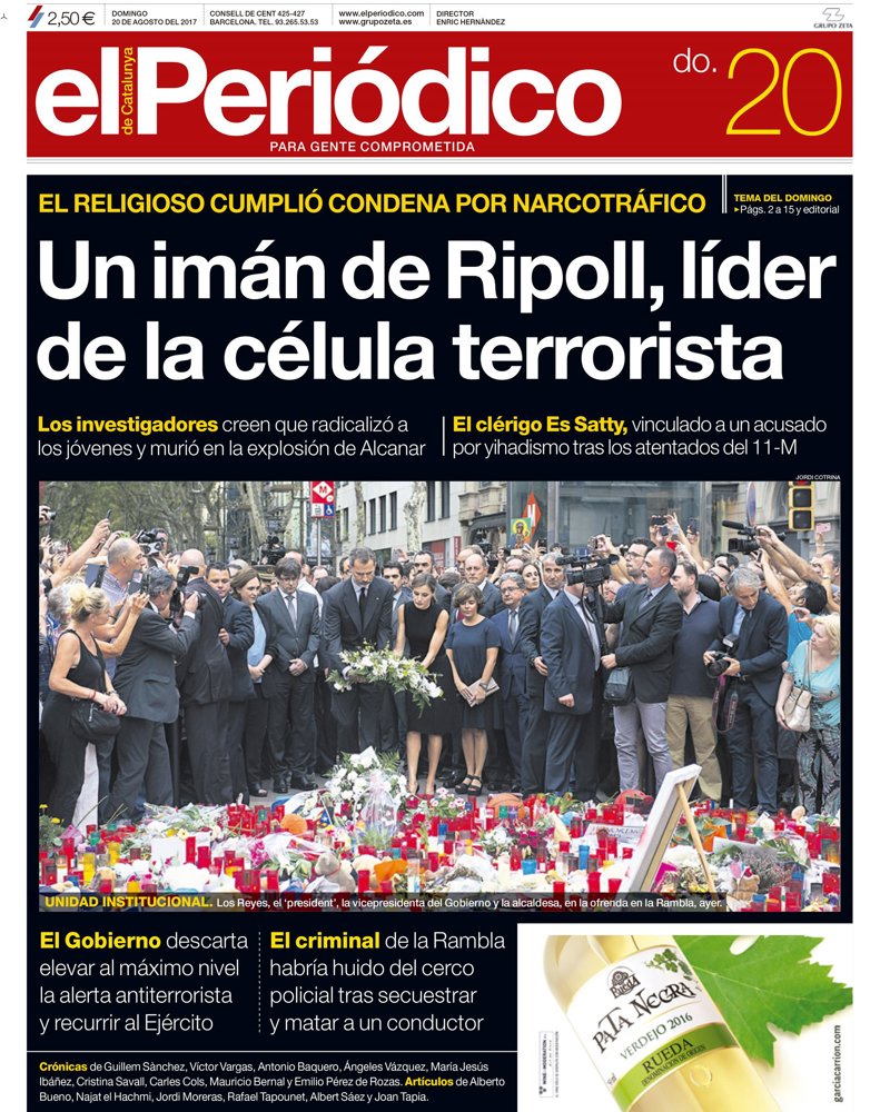 --EL PERIÓDICO: "Un imán de Ripoll, líder de la célula terrorista"; "El Gobierno descarta elevar al máxima nivel la alerta antiterrorista y recurrir al Ejército"; "El criminal de la Rambla habría huido del cerco policial tras secuestrar y matar a un conductor".