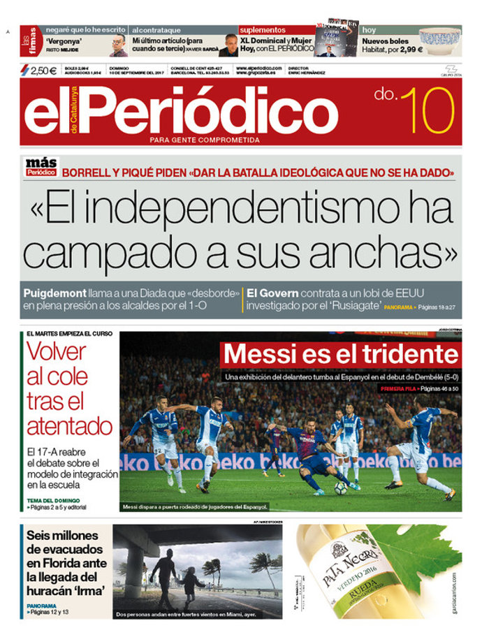 EL PERIÓDICO: "Borrel y Piqué piden 'dar la batalla ideológica que no se ha dado': 'El independentismo ha campado a sus anchas'"; "Volver al cole tras el atentado"; "Messi es el tridente"; "Seis millones de evacuados en Florida ante la llegada del huracán 'Irma'".