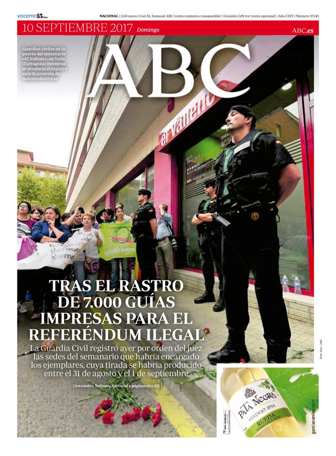 ABC: "Tras el rastro de 7.000 guías impresas para el referéndum ilegal"; "PP y Cs recuperan terreno y ganan a PSOE y Podemos por 21 escaños"; "Contador, broche de oro en El Angliru"; "El huracán Irma apunta al oeste y obliga a evacuar a 6,3 millones de personas en Florida"; "México busca entre los escombros a los supervivientes del terremoto"; "Expulsado un imán por relacionar los atentados con las misiones de España en el exterior"; "Fútbol: El Madrid se abona al empate en el Bernabéu, esta vez frente al Levante (1-1)"; "Tenis: Nadal, favorito esta noche ante Anderson en la final del US Open"; "Baloncesto: España teme un ambiente hostil en los octavos ante Turquía".