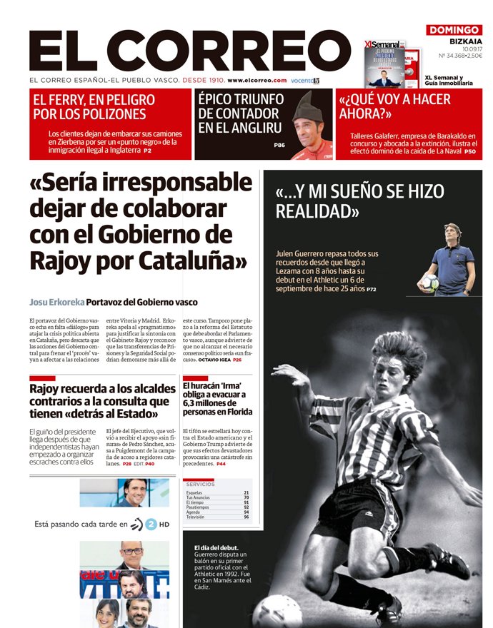 EL CORREO: "Josu Erkoreka: 'Sería irresponsable dejar de colaborar con el Gobierno de Rajoy por Cataluña'"; "Rajoy recuerda a los alcaldes contrarios a la consulta que tienen 'detrás al Estado'"; "El huracán 'Irma' obliga a evacuar 6,3 millones de personas en Florida"; "Julen Guerrero: '... Y mi sueño se hizo realidad'"; "El ferry, en peligro por los polizones"; "Épico triunfo de Contador en El Angliru"; "Talleres Galaferr: '¿Qué voy a hacer ahora?'".