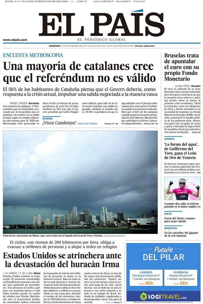 EL PAÍS: "Una mayoría de catalanes cree que el referéndum no es válido"; "Estados Unidos se atrinchera ante la devastación del huracán Irma"; "Bruselas trata de apuntalar el euro con su propio Fondo Monetario"; "'La forma del agua', de Guillermo del Toro, gana el León de Oro de Venecia"; "Corea del Norte: razones para tener miedo"; "En las entrañas del gigante de la red Amazon".