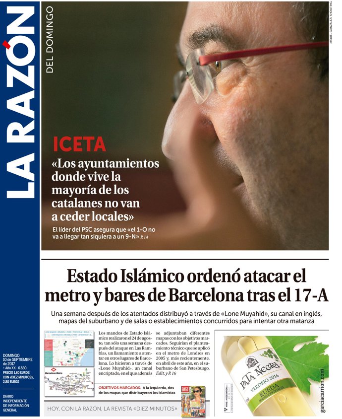 LA RAZÓN: "Iceta: 'Los ayuntamientos donde vive la mayoría de los catalanes no van a ceder locales'"; "Estado Islámico ordenó atacar el metro y bares de Barcelona tras el 17-A".