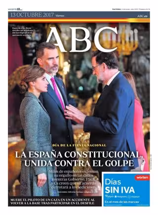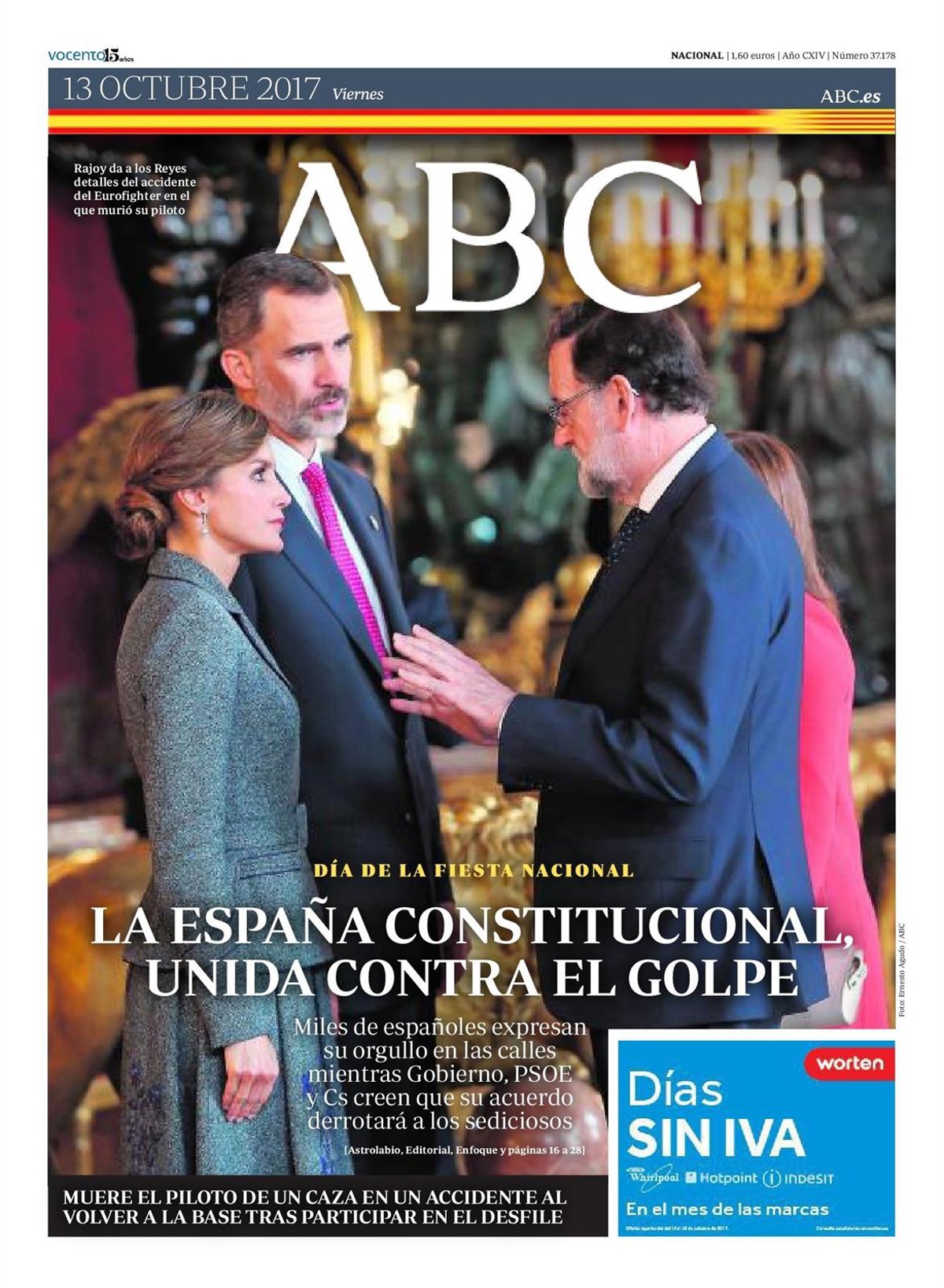 ABC: "La España constitucional, unida contra el golpe"; "Muere el piloto de un caza en un accidente al volver a la base tras participar en el desfile"; "Cataluña puede entrar en recesión si continúa el desafío, alerta S&P"; "Los catalanes ya no temen al separatismo"; "Los organizadores del referéndum ilegal planearon exagerar la participación"; "Trump retira a EEUU de la Unesco por su politización y 'discriminación continua' a Israel"; "La ONU elige a España como modelo en la lucha contra la siniestralidad vial"; "El negociador de la UE considera que el Brexit se halla en un 'callejón sin salida'".