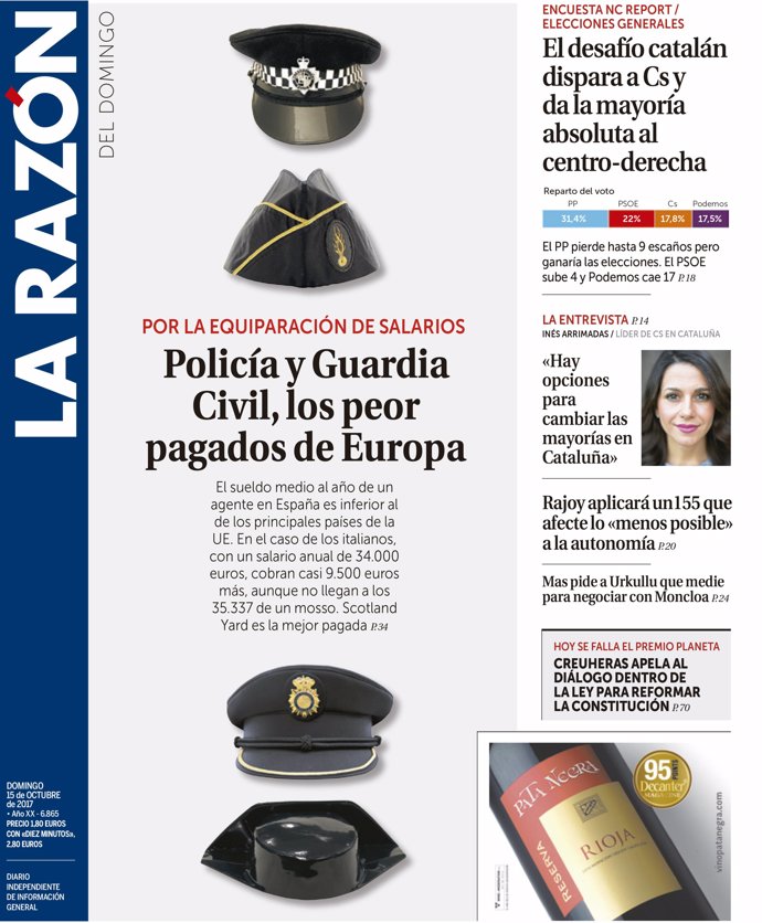 -- LA RAZÓN: "Policía y Guardia Civil, los peor pagados de Europa"; "El desafío catalán dispara a Cs y da la mayoría absoluta al centro-derecha"; "Inés Arrimadas: 'Hay opciones para cambiar las mayorías en Cataluña'"; "Rajoy aplicará un 155 que afecte lo 'menos posible' a la autonomía"; "Mas pide a Urkullu que medie para negociar a Moncloa"; "Crehueras apela al diálogo dentro de la ley para modificar la Constitución".