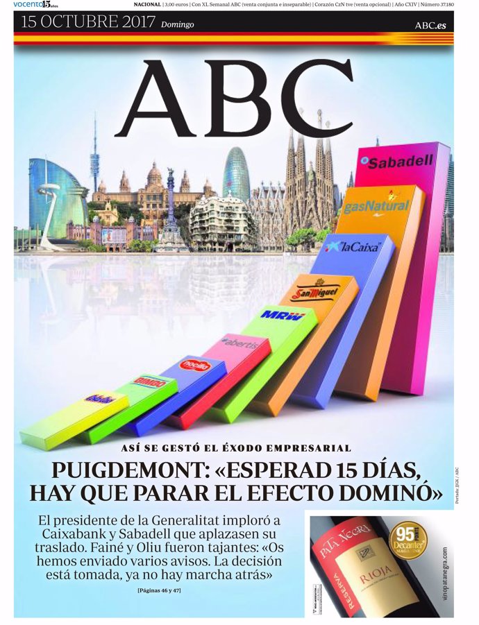 -- ABC: "Puigdemont: 'Esperad 15 días, hay que parar el efecto dominó'"; "Los mossos constitucionalistas se unen contra la secesión"; "La CUP abandonará el Parlament si el Govern no proclama ya la república"; "Mas busca romper la mayoría independentista y forzar unas elecciones"; "Preocupación en Podemos por la falta de discurso para toda España"; "Atlético y Barça, entre banderas de España"; "El centroderecha, favorito en las legislativas de hoy en Austria"; "Italia ambiciona el negocio de empresas españolas en Iberoamérica".