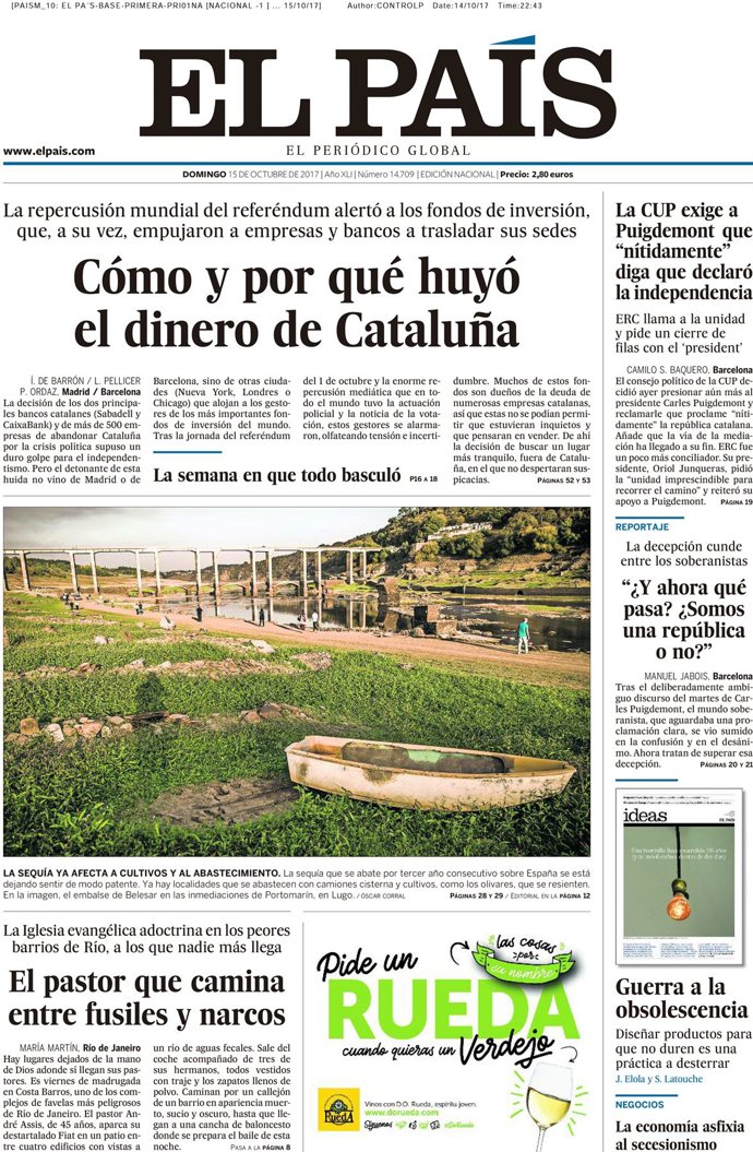 -- EL PAÍS: "Cómo y por qué huyó el dinero de Cataluña"; "La CUP exige a Puigdemont que 'nítidamente' diga que declaró la independencia"; "¿Y ahora qué pasa? ¿Somos una república o no?"; "El pastor que camina entre fusiles y narcos"; "Guerra a la obsolescencia"; "La economía asfixia al secesionismo".