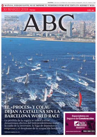 -- ABC: "El 'procés' y Colau dejan a Cataluña sin la Barcelona World Race"; "El Presupuesto bonificará con 430 euros a jóvenes con contrato de formación"; "El Papa lava los pies a un budista y dos musulmanes"; "Cae el principal clan rumano de la prostitución callejera del centro de Madrid"; "Mueren abrasadas tras un motín 68 personas hacinadas en una comisaría en Venezuela"; "Trump acusa a Amazon de provocar el cierre de miles de pequeños comercios"; "Varios juzgados investigarán si el PSOE valenciano facturó en B gastos por un millón de euros".