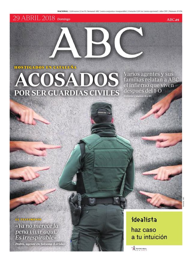 -- ABC: "Acosados por ser guardias civiles"; "Ya no merece la pena vivir aquí. Es irrespirable"; "El PP busca impulsar a Casado de candidato desde la gestora"; "La Armada critica a Colau por llamar 'facha' al almirante Cervera: Es decepcionante"; "El Gobierno quiere presentar cuanto antes el nuevo impuesto digital a las tecnologías"; "Muere el pequeño Alfie tras una dura batalla legal".