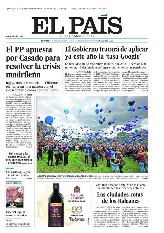 -- EL PAÍS: "El PP apuesta por Casado para resolver la crisis madrileña"; "El Gobierno tratará de aplicar ya este año la 'tasa Google'"; "Del máster a las cremas robadas: el mes en el que cayó la presidenta"; "La muerte del niño Alfie Evans conmociona a Reino Unido"; "Las ciudades rotas de los Balcanes"; "Especial lujo, el valor único"; "La guerra de los pesticidas".