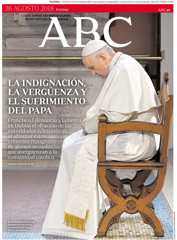 -- ABC: "La indignación, la vergüenza y el sufrimiento del Papa"; "La violencia separatista irrumpe en Cataluña"; "Sánchez quiere expulsar 'siempre que pueda' a los sin papeles a Marruecos"; "La familia de Franco reitera su oposición 'firme y unánime' a la exhumación"; "Griezmann y Oblak dan la victoria a un gris Atlético ante el Rayo (1-0)".