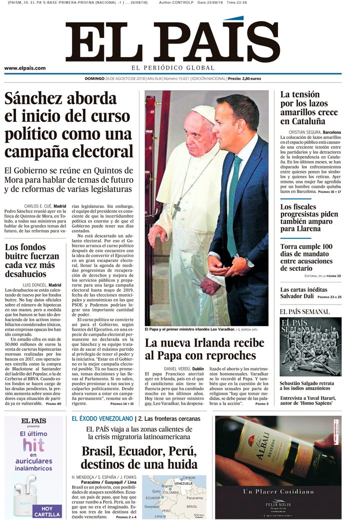 -- EL PAÍS: "Sánchez aborda el inicio del curso político como una campaña electoral"; "La nueva Irlanda recibe al Papa con reproches"; "Los fondos buitre fuerzan cada vez más desahucios"; "La tensión por los lazos amarillos crece en Cataluña"; "Los fiscales progresistas piden también amparo para Llarena"; "Torra cumple 100 días de mandato entre acusaciones de sectario"; "Brasil, Ecuador, Perú, destinos de huida".