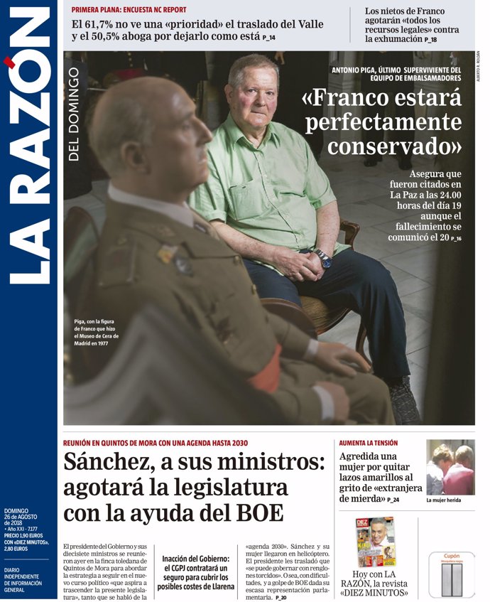 -- LA RAZÓN: "Antonio Piga, último superviviente del equipo de embalsamadores: 'Franco estará perfectamente conservado'"; "Sánchez, a sus ministros: agotará la legislatura con la ayuda del BOE"; "El 61,7% no ve una 'prioridad' el traslado del Valle y el 50,5 aboga por dejarlo como está"; "Los nietos de Franco agotarán 'todos los recursos legales' contra la exhumación"; "Agredida una mujer por quitar lazos amarillos al grito de 'extranjera de mierda'".