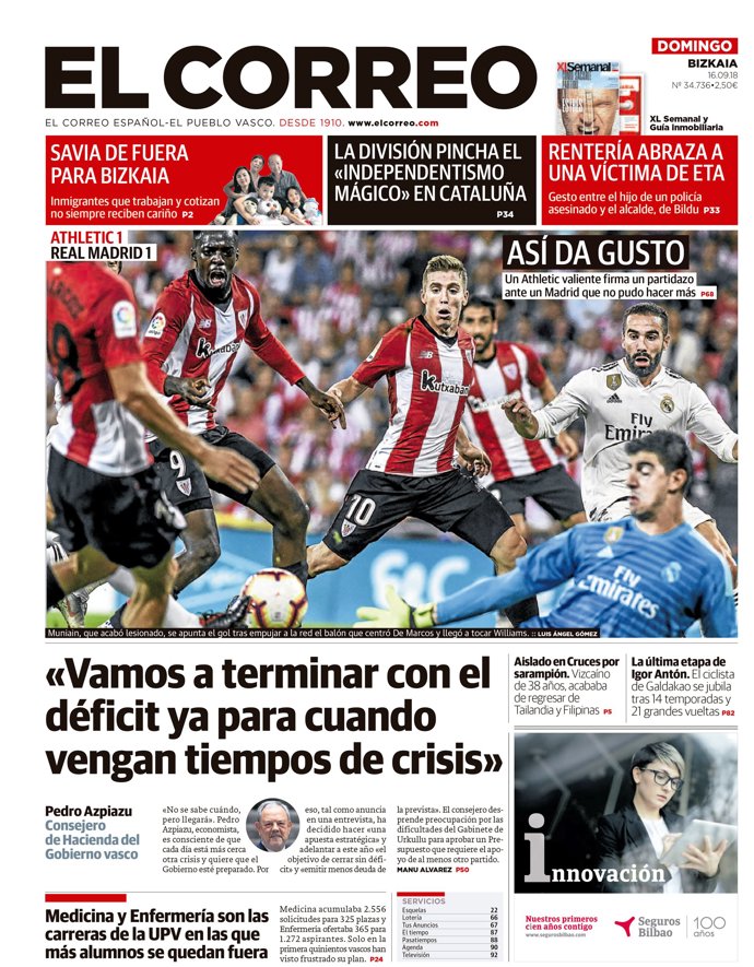 -- EL CORREO: "Un Athletic valiente firma un partidazo ante un Madrid que no pudo hacer más"; "Pedro Azpiazu: 'Vamos a terminar con el déficit ya para cuando vengan tiempos de crisis'"; "Medicina y Enfermería son las carreras de la UPV en las que más alumnos se quedan fuera".