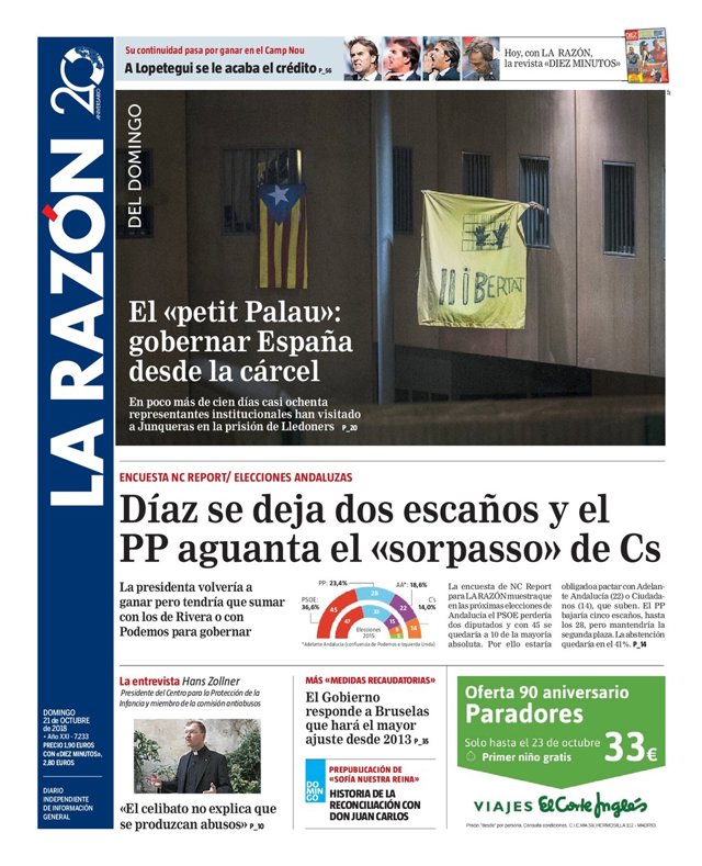 LA RAZÓN: "Díaz se deja dos escaños y el PP aguanta el 'sorpasso' de Ciudadanos"; "El 'petit Palau':gobernar España desde la cárcel"; "El Gobierno responde a Bruselas que hará el mayor ajuste desde 2013".