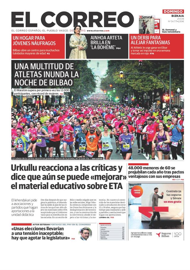 EL CORREO: "Una multitud de atletas inunda la noche de Bilbao"; "Urkullu reacciona a las críticas y dice que aún se puede 'mejorar' el material educativo sobre ETA"; "48.000 menores de 60 se prejubilan cada año tras pactos ventajosos con sus empresas".
