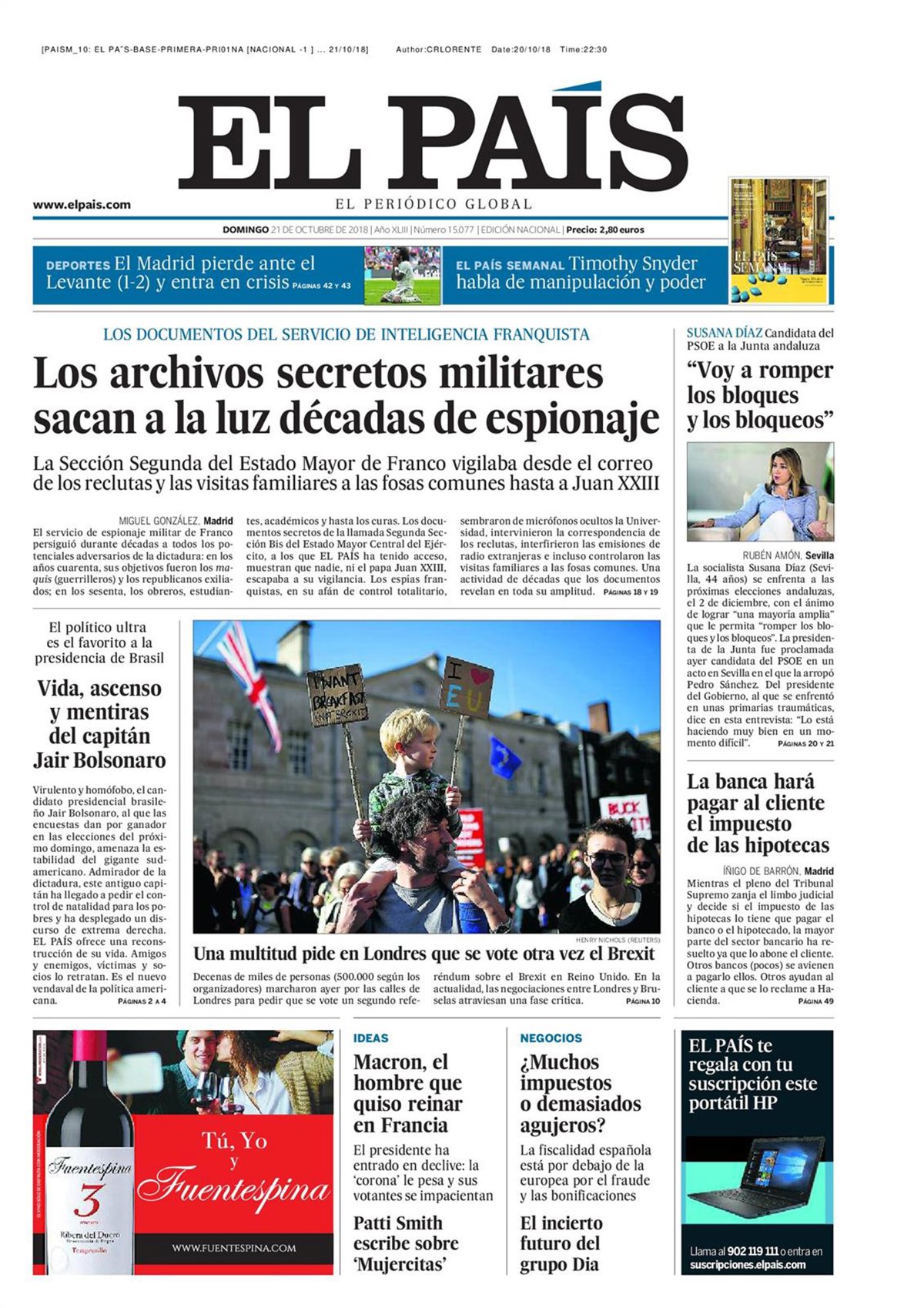 EL PAÍS: "Los archivos secretos militares sacan a la luz décadas de espionaje"; "Vida, ascenso y mentiras del capitán Jair Bolsonaro"; "Una multitud pide en Londres que se vote otra vez el Brexit"; Susana Díaz: "Voy a romper los bloques y los bloqueos"; "La banca hará pagar al cliente el impuesto de las hipotecas".