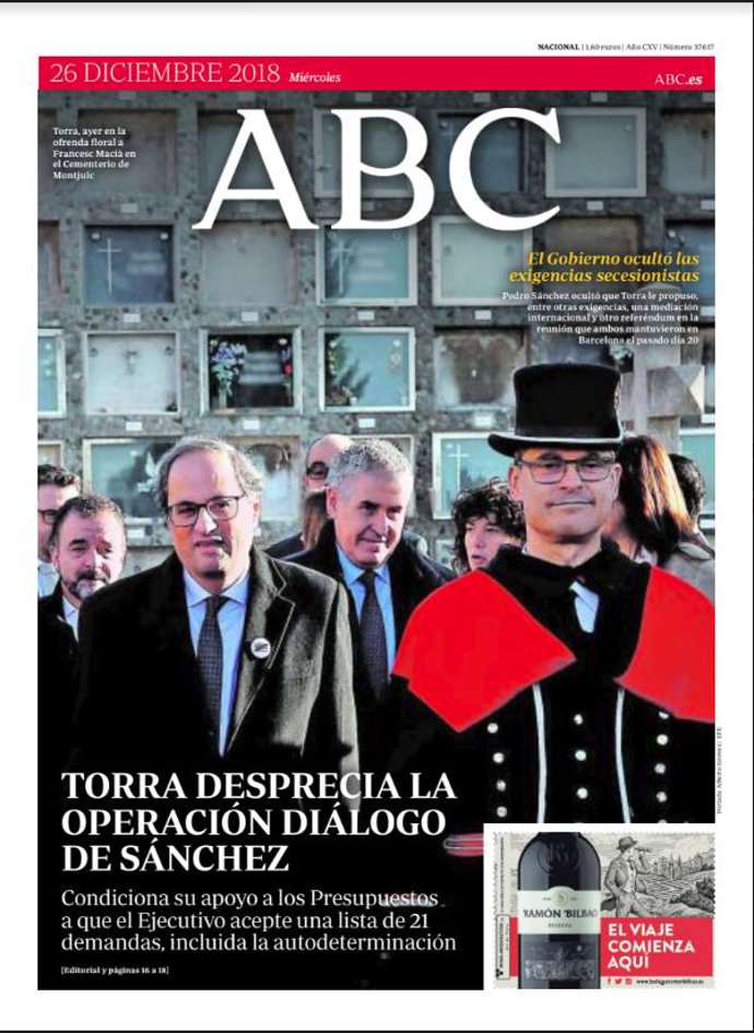 ABC: "Torra desprecia la operación diálogo de Sánchez"; "El Gobierno ocultó las exigencias secesionistas".