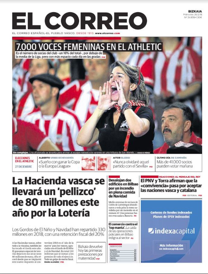 EL CORREO: "La Hacienda vasca se llevará un 0pellizco' de 80 millones este año por la Lotería"; "7.000 voces femeninas en el Athletic"; "Desalojan dos edificios en Bilbao por un incendio en plena comida de Navidad"; "El PNV y Torra afirman que la "convivencia" pasa por aceptar las naciones vasca y catalana".