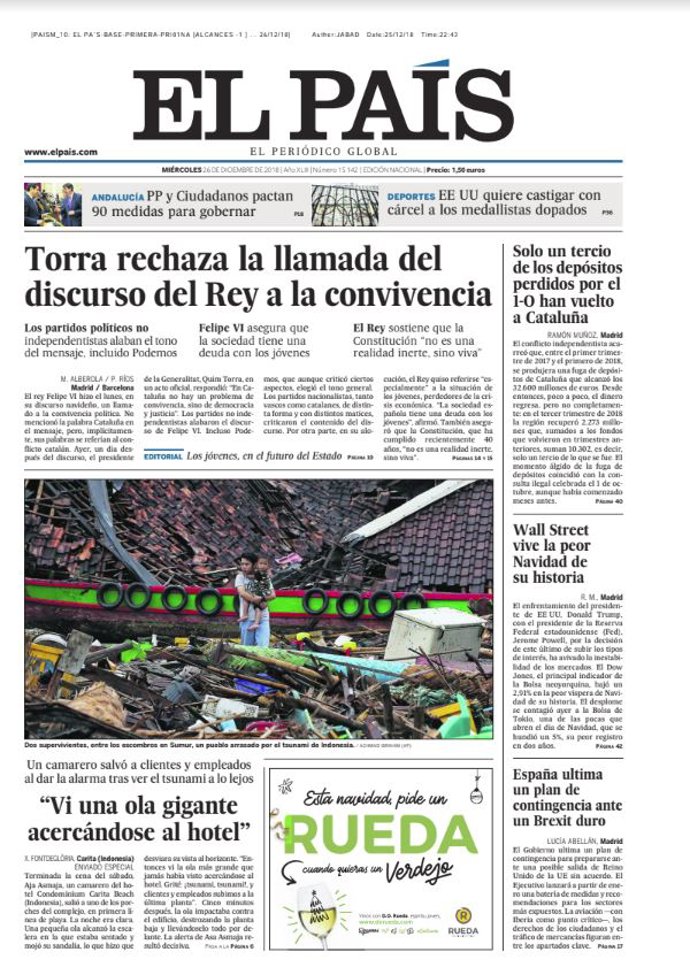 EL PAÍS: "Torra rechaza la llamada del discurso del Rey a la convivencia"; "Solo un tercio de los depósitos perdidos por el 1-O han vuelto a Cataluña"; "Wall Street vive la peor Navidad de su historia"; "España ultima un plan de contingencia ante un Brexit duro".