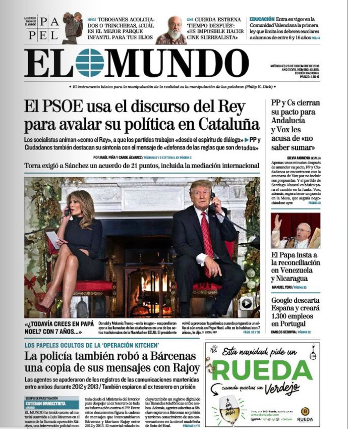 EL MUNDO: "El PSOE usa el discurso del Rey para avalar su política en Cataluña"; "La policía también robó a Bárcenas una copia de sus mensajes con Rajoy"; "PP y Cs cierran su pacto para Andalucía y Vox les acusa de "no saber sumar""; "El Papa insta a la reconciliación en Venezuela y Nicaragua"; "Google descarta España y creará 1.300 empleos en Portugal".