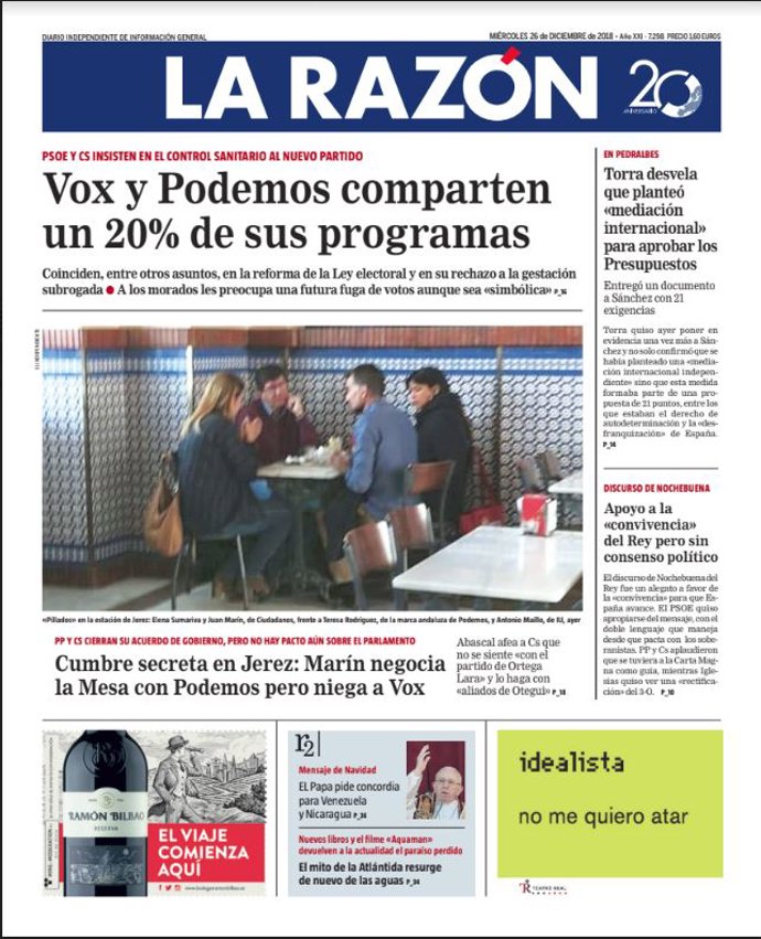 LA RAZÓN: "Vox y Podemos comparten un 20% de sus programas"; "Torra desvela que planteó "mediación internacional" para aprobar los Presupuestos"; "Cumbre secreta en Jerez: Marín negocia la Mesa con Podemos pero niega a Vox"; "Apoyo a la "convivencia" del Rey pero sin consenso político".