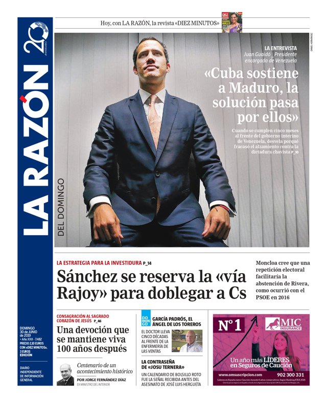 LA RAZÓN: Entrevista al presidente encargado de Venezuela, Juan Guaidó: "Cuba sostiene a Maduro, la solución pasa por ellos"; "Sánchez se reserva la 'vía Rajoy' para doblegar a Ciudadanos"; "Moncloa cree que una repetición electoral facilitaría la abstención de Rivera, como ocurrió con el PSOE en 2016".