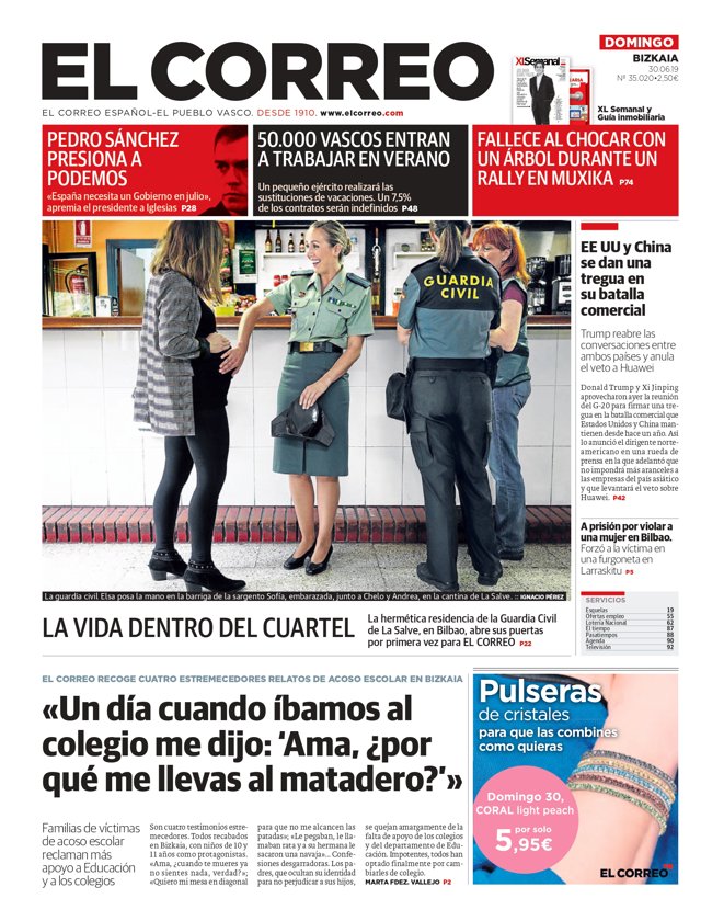 EL CORREO: El Correo recoge cuatro estremecedores relatos de acoso escolar en Vizcaya: "Un día cuando íbamos al colegio me dijo: 'Ama, ¿por qué me llevas al matadero'"; "EE.UU. y China se dan una tregua en su batalla comercial".