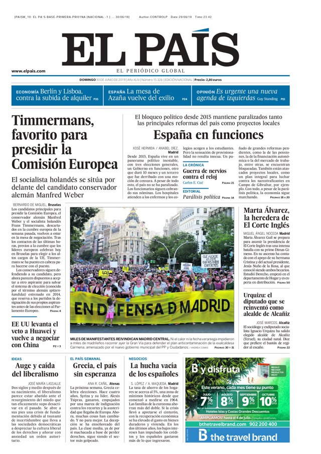 EL PAÍS: "Timmermans, favorito para presidir la Comisión Europea"; "EE.UU. levanta el veto a Huawei y vuelve a negociar con China"; "El bloqueo político desde 2015 mantiene paralizados tanto las principales reformas del país como proyectos locales"; "Marta Álvarez, la heredera de El Corte Inglés".