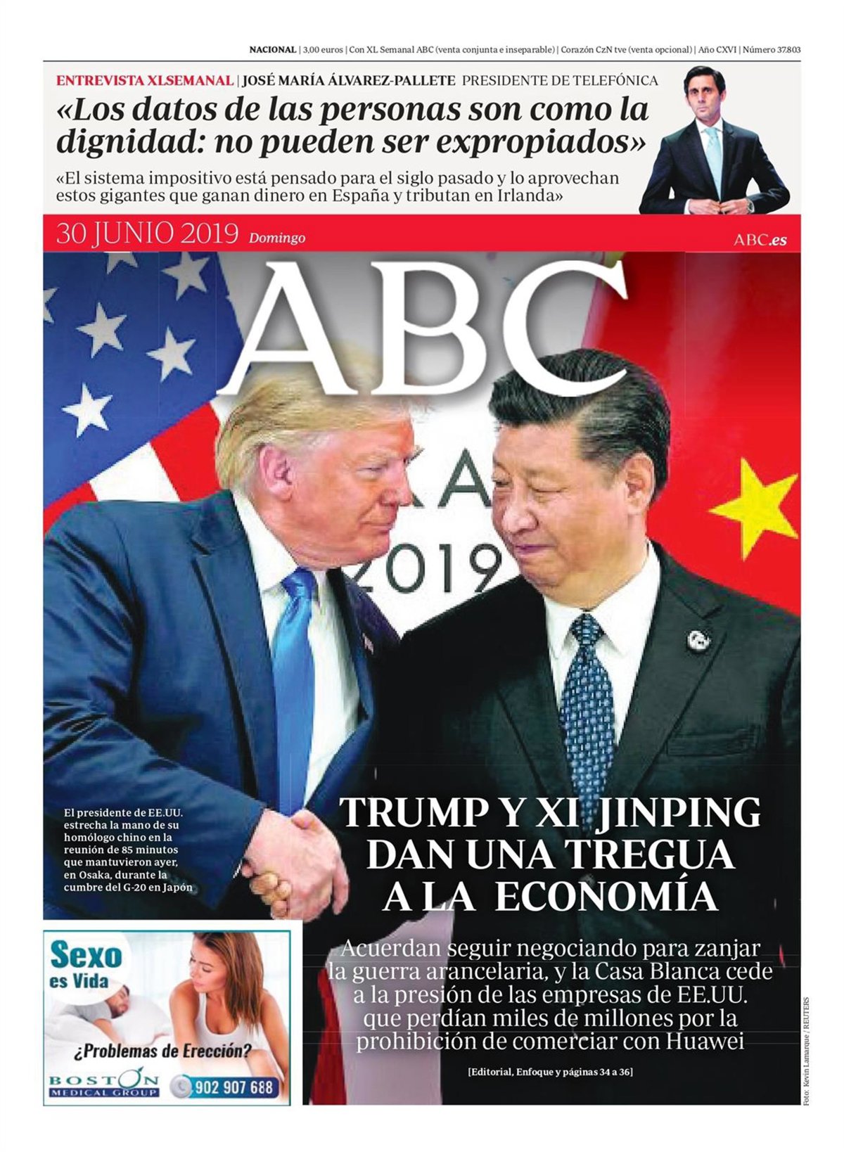 ABC: "Trump y Xi Jinping dan una tregua a la economía"; "Acuerdan seguir negociando para zanjar la guerra arancelaria, y la Casa Blanca cede a la presión de las empresas de Estados Unidos que perdían miles de millones por la prohibición de comerciar con Huawei".