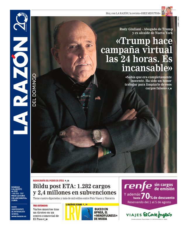 LA RAZÓN: Rudy Giuliani, abogado de Trump y exalcalde de Nueva York: "Trump hace campaña virtual las 24 horas. Es incansable"; "Sabía que era completamente inocente. Ha sido un honor trabajar para limpiarle de esos cargos falsos"; "Bildu post ETA: 1.282 cargos y 2,4 millones en subvencione"; "Varios muertos tras un tiroteo en un centro comercial de El Paso".