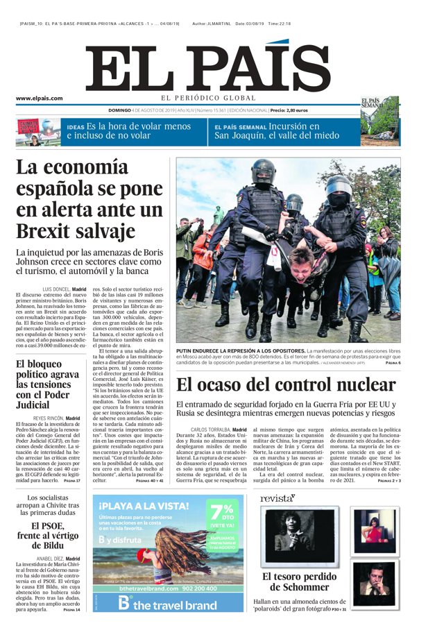 EL PAÍS: "La economía española se pone en alerta ante un Brexit salvaje"; "El bloqueo político agrava las tensiones con el Poder Judicial"; "El PSOE frente al vértigo de Bildu"; "El ocaso del control nuclear".