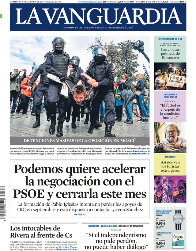 LA VANGUARDIA: "Podemos quiere acelerar la negociación con el PSOE y cerrarla este mes"; "La formación de Pablo Iglesias intenta no perder los apoyos de ERC en septiembre y está dispuesta a contactar ya con Sánchez"; "Los intocables de Rivera al frente de Cs"; "Detenciones masivas de la oposición en Moscú".