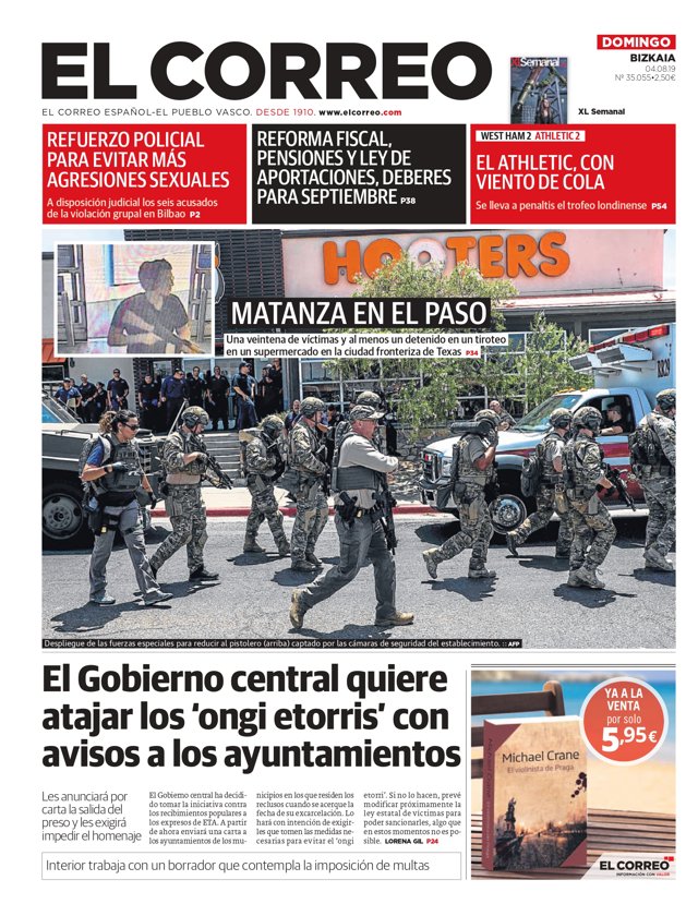 EL CORREO: "El Gobierno central quiere atajar los 'ongi etorris' con avisos a los ayuntamientos"; "Les anunciará por carta la salida del preso y les exigirá impedir el homenaje"; "Matanza en el paso. Una veintena de víctimas y al menos un detenido en un tiroteo en un supermercado en la ciudad fronteriza de Texas".