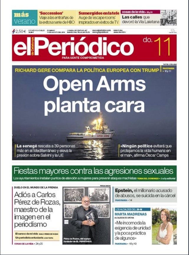 EL PERIÓDICO: "Open Arms planta cara. Richard Gere compara la política europea con Trump"; "Fiestas mayores contra las agresiones sexuales"; "Adiós a Carlos Pérez de Rozas, maestro de la imagen en el periodismo"; "Epstein, el millonario acusado de abusos, se suicida en la cárcel".