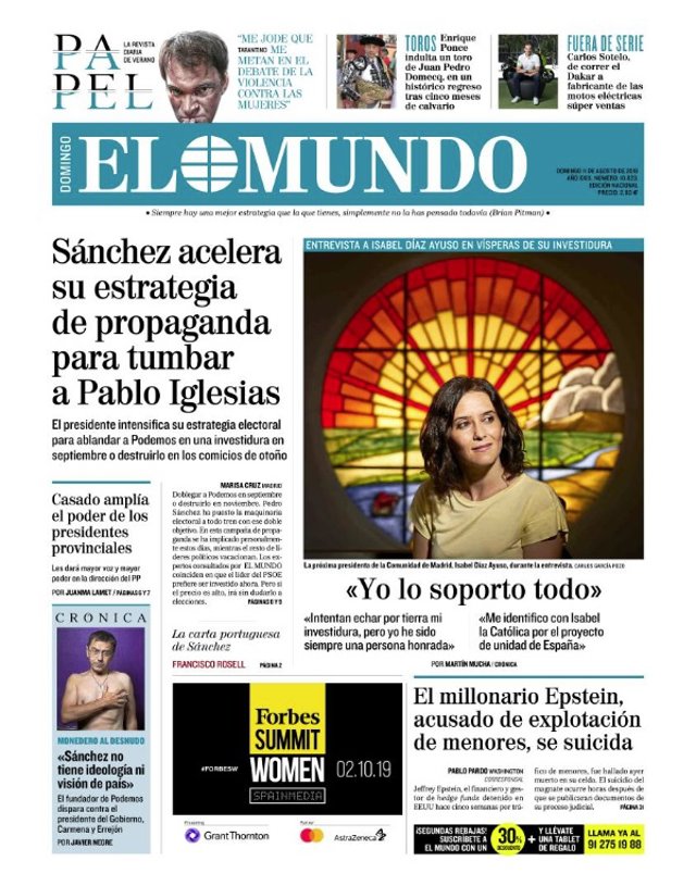 EL MUNDO: "Sánchez acelera su estrategia de propaganda para tumbar a Pablo Iglesias"; "Casado amplía el poder de los presidentes provinciales"; "Entrevista a Isabel Díaz Ayuso en vísperas de su investidura: 'Yo lo soporto todo'"; "El millonario Epstein, acusado de explotación de menores, se suicida".