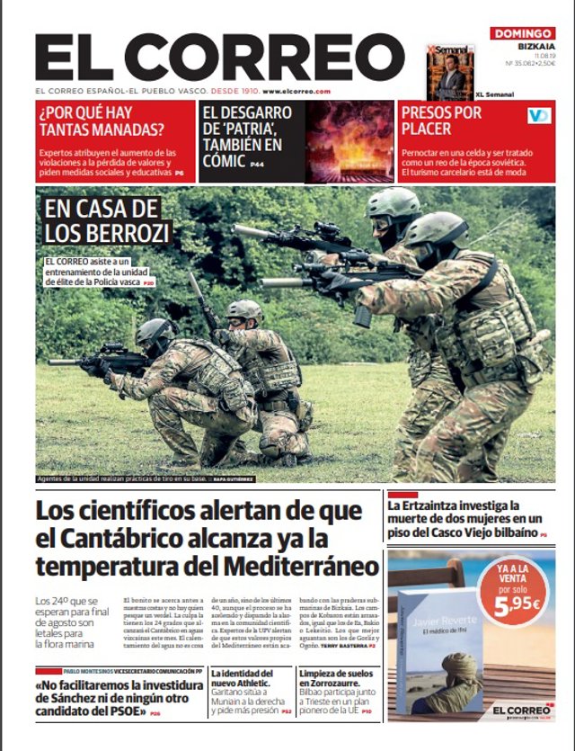 EL CORREO: "En casa de los Berrozi. El Correo asiste a un entrenamiento de la unidad de élite de la Policía vasca"; "Los científicos alertan de que el Cantábrico alcanza ya la temperatura del Mediterráneo"; "La Ertzaintza investiga la muerte de dos mujeres en un piso del Casco Viejo bilbaíno"; ¿Por qué hay tantas manadas? Expertos atribuyen el aumento de las violaciones a la pérdida de valores y piden medidas sociales y educativas"; "Pablo Montesinos, vicesecretario de Comunicación del PP: 'No facilitaremos la investidura de Sánchez ni de ningún otro candidato del PSOE'".